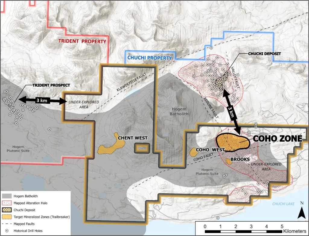 Trailbreaker’s Coho property is contiguous with the Chuchi Project which is currently being advanced by a joint venture between Centerra Gold and Pacific Ridge Exploration. The Chuchi Project has undergone a considerable amount of exploration since its discovery in the 1960s, by companies such as Noranda, BP, and AuRico, with over 11,000 meters of diamond drilling in 53 drill holes. The majority of this drilling has been focused on the BP zone which represents a 1.5 km x 1.5 km area of copper-gold mineralization with a historic, non-NI 43-101 compliant resource of 50 million tonnes grading between 0.21 – 0.40% Cu and 0.21 – 0.44 g/t Au. Significant drill intersections include: 16 m of 1.55% CuEq within 100 meters of 0.51% CuEq (1991 drill campaign), and 382 meters of 0.27% CuEq (2024 drill campaign). The BP zone sits on the north-south Valley/Redline fault structure that trends south into Trailbreaker’s Coho property.