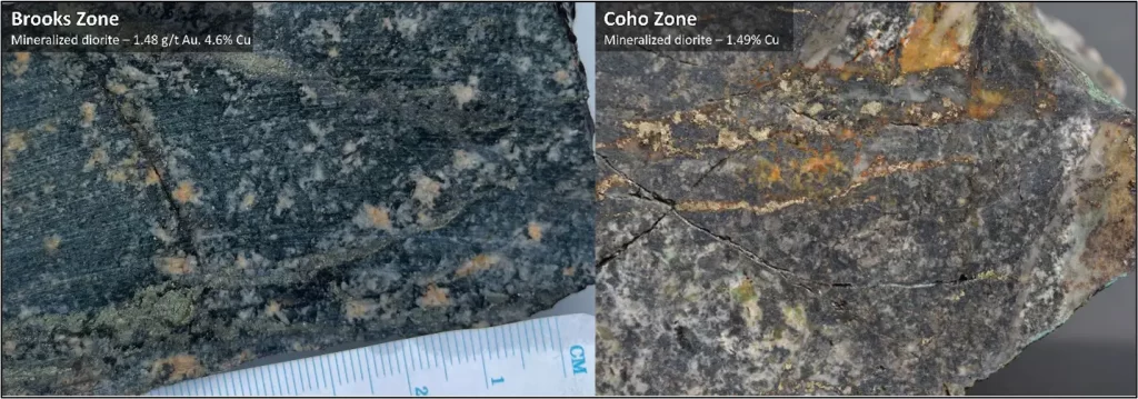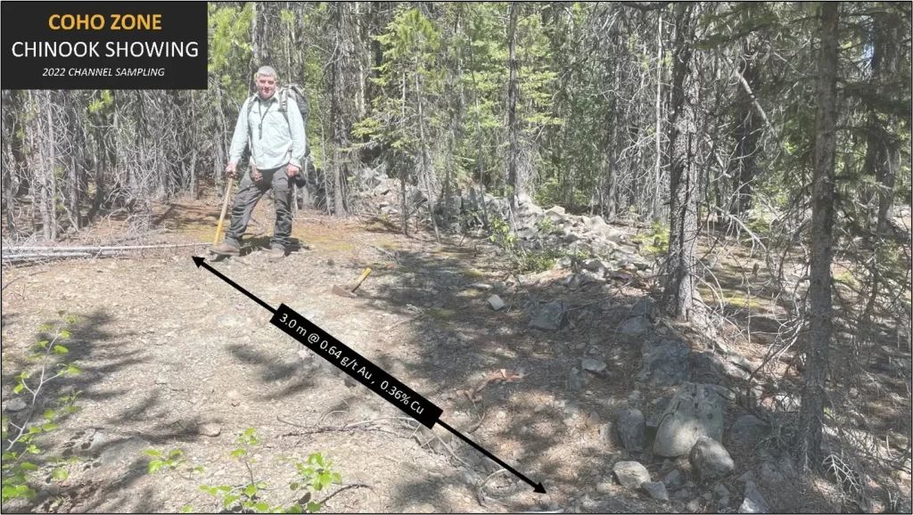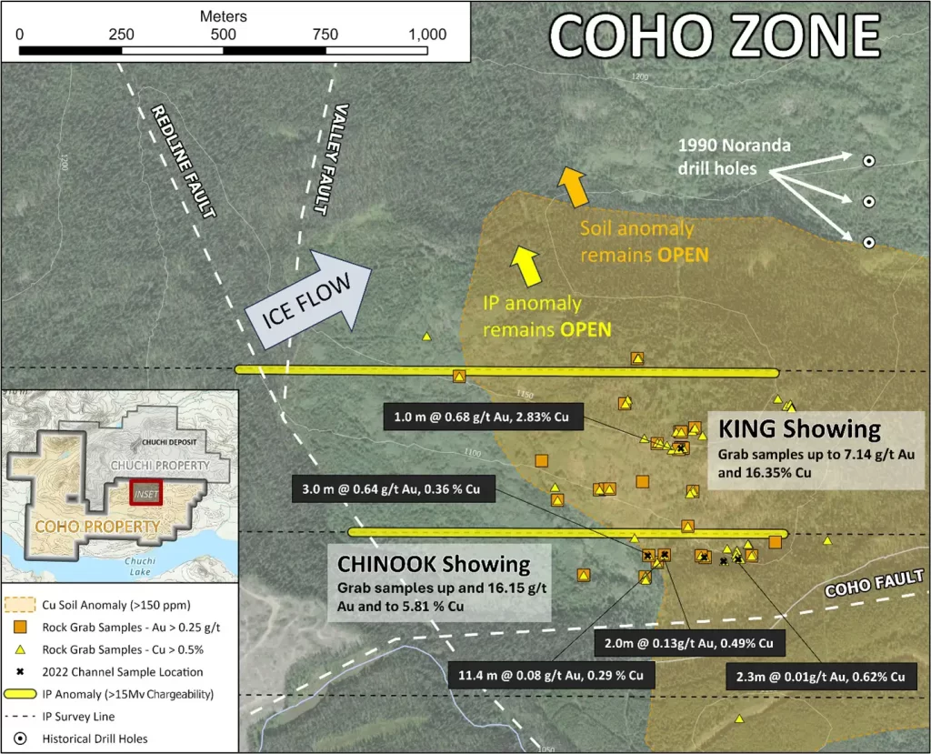 The Coho zone is the priority target and is defined by a 650 x 550 m Cu-Au-Ag surface geochemical anomaly that is hosted in diorite and spatially associated with an ENE-trending fault zone (Coho fault) and gabbro dykes. Two additional faults, the Valley and Redline, extend south from the BP zone (Chuchi Project) and converge with the Coho fault at the Coho zone.