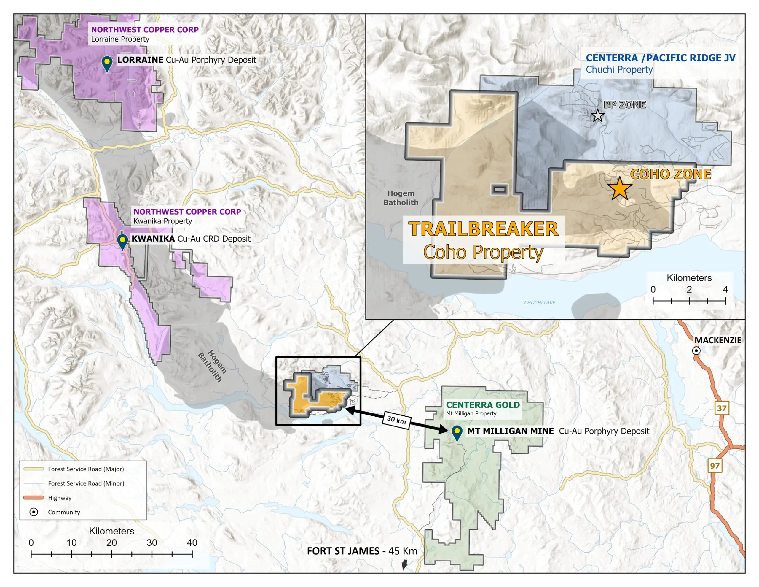 Trailbreaker’s Coho property is contiguous with the Chuchi Project which is currently being advanced by a joint venture between Centerra Gold and Pacific Ridge Exploration. The Chuchi Project has undergone a considerable amount of exploration since its discovery in the 1960s, by companies such as Noranda, BP, and AuRico, with over 11,000 meters of diamond drilling in 53 drill holes. The majority of this drilling has been focused on the BP zone which represents a 1.5 km x 1.5 km area of copper-gold mineralization with a historic, non-NI 43-101 compliant resource of 50 million tonnes grading between 0.21 – 0.40% Cu and 0.21 – 0.44 g/t Au. Significant drill intersections include: 16 m of 1.55% CuEq within 100 meters of 0.51% CuEq (1991 drill campaign), and 382 meters of 0.27% CuEq (2024 drill campaign). The BP zone sits on the north-south Valley/Redline fault structure that trends south into Trailbreaker’s Coho property.