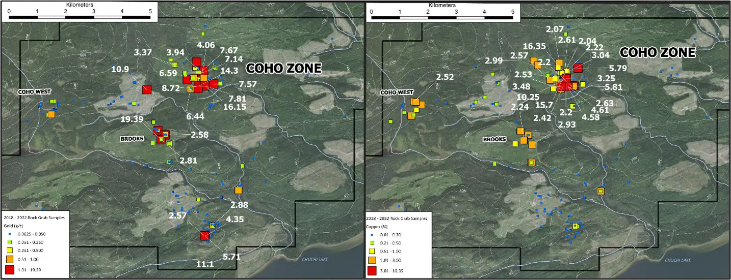 A total of 135 rock grab samples taken at the Coho zone from 2020 to 2022 returned the following values: