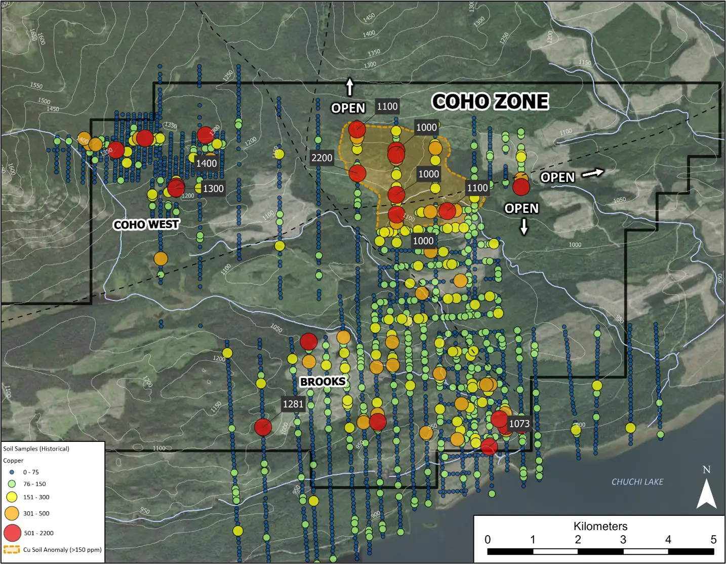 Exploration at the Coho property dates back to the 1960s and includes property-wide soil geochemical surveys, geophysical surveys, and 2,186 meters of diamond drilling in 20 widely spaced holes. Several kilometer-scale geochemical anomalies have been defined, and narrow, high-grade copper-gold values were intersected in historic diamond drill holes. Recent exploration efforts have outlined several new copper-gold porphyry targets that remain to be drill tested. These include the Chent West, Coho West, Brooks, and Coho zones.