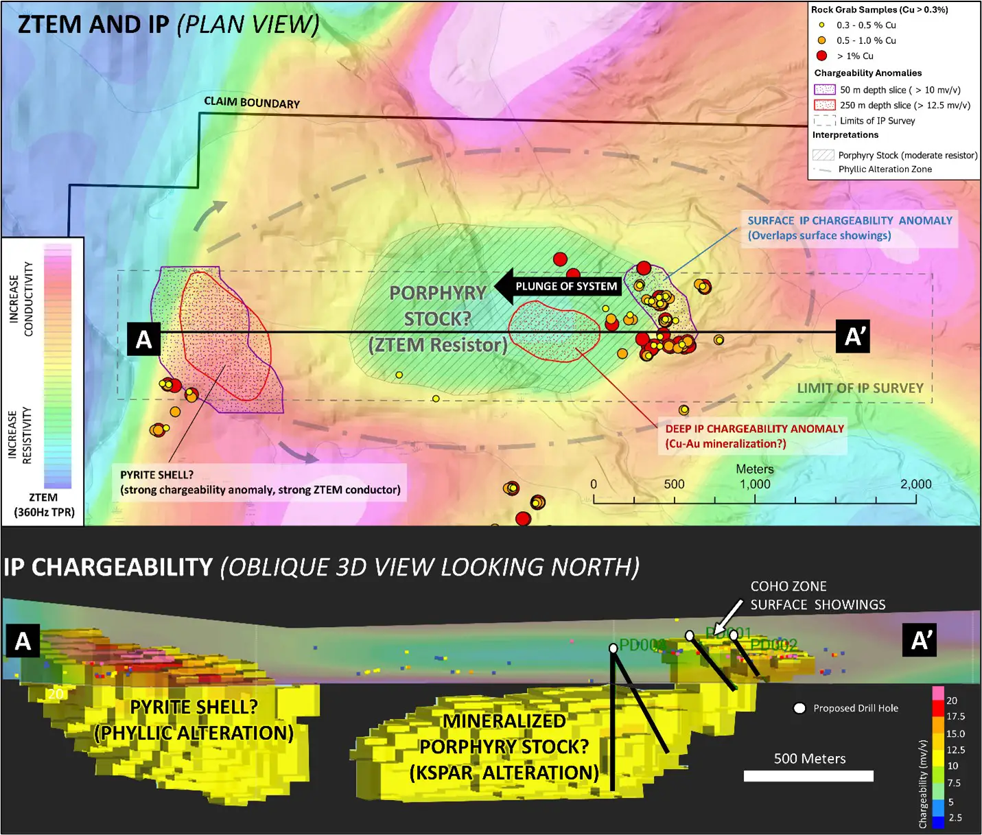 A recent (2022/2023) airborne ZTEM and ground-based IP survey identified a 400 m x 250 m x 200 m deep interpreted porphyry intrusive complex (3D ZTEM anomaly) with a two-limbed IP chargeability high anomaly that spans more than 1.4 km. The chargeability limbs may be associated with phyllic alteration surrounding a central mineralized potassic-altered porphyry core. The eastern limb underlies both the surface geochemical anomaly and 3D ZTEM intrusive complex identified at the Coho zone and is believed to represent an eastward tilted porphyry copper-gold system similar to the nearby Mount Milligan deposit.