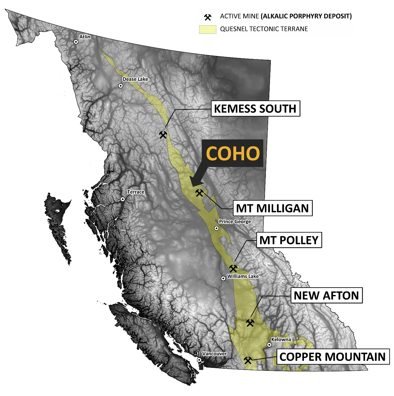 The 8000-hectare Coho property is an early-stage alkalic copper-gold (Cu-Au) porphyry target located in central British Columbia, 90 km north of the town of Fort St. James, BC. It is situated within the prolific Quesnel tectonic terrane which hosts many of BC’s largest Cu-Au porphyry deposits. Centerra Gold’s Mount Milligan Mine (2.8 Moz Au, 1.2 B lb Cu) is located 30 km southwest of the Coho property and shares similar geology and mineralization. The property is under option for 100% ownership and is fully permitted for diamond drilling.